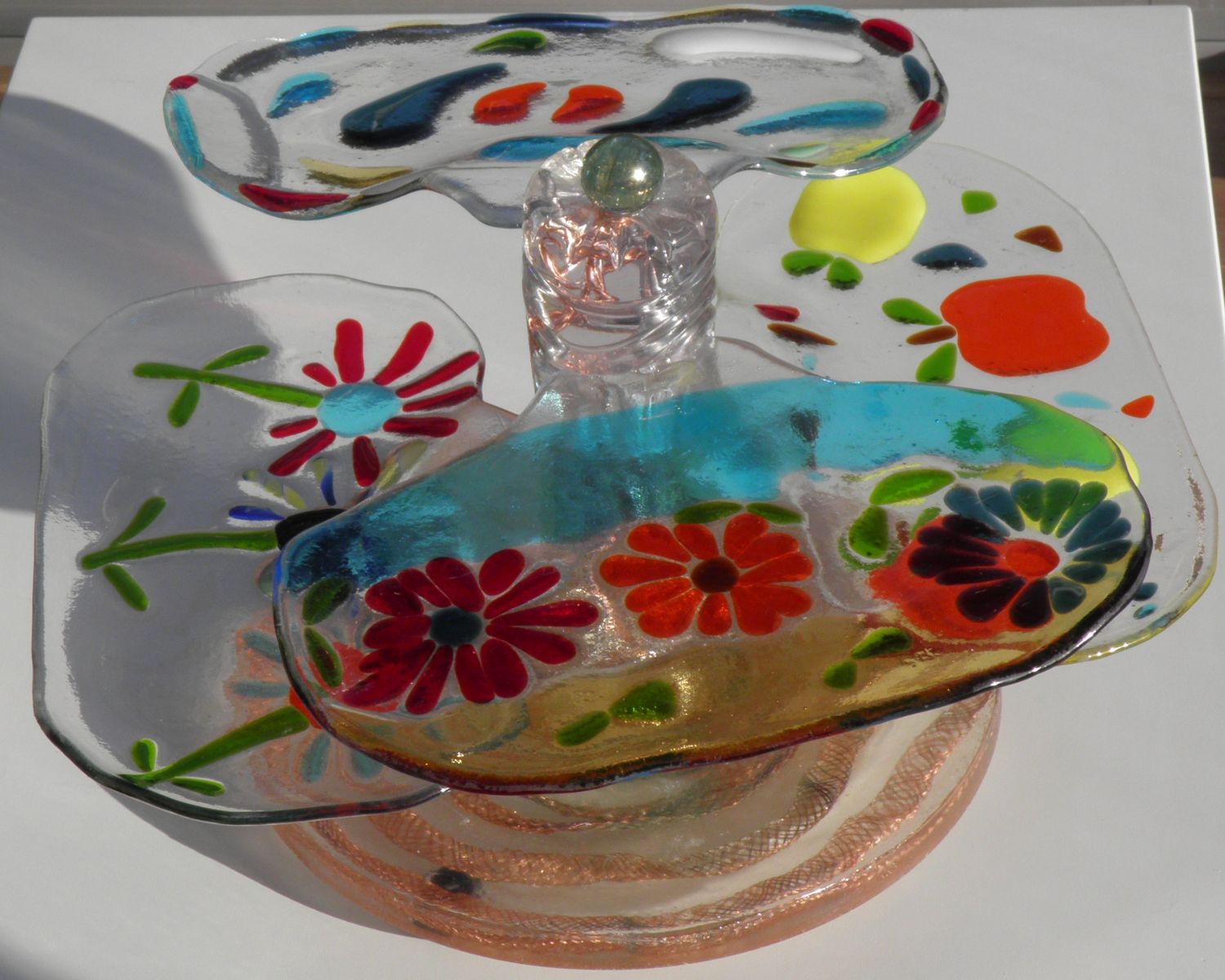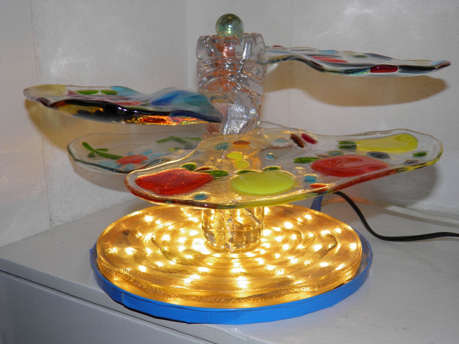 Etagiaire. Set of glass dishes with different motives in standard. Glassfusion, sythetic resin, copper aluminium. With ledlights.
